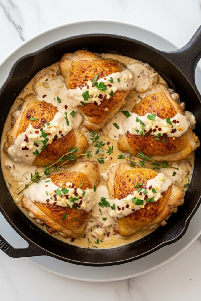 These crispy and juicy chicken thighs are made in one skillet with a rich, garlic cream sauce. The perfect dinner for busy weeknights or easy entertaining. Simple, flavorful, and easy to clean up!