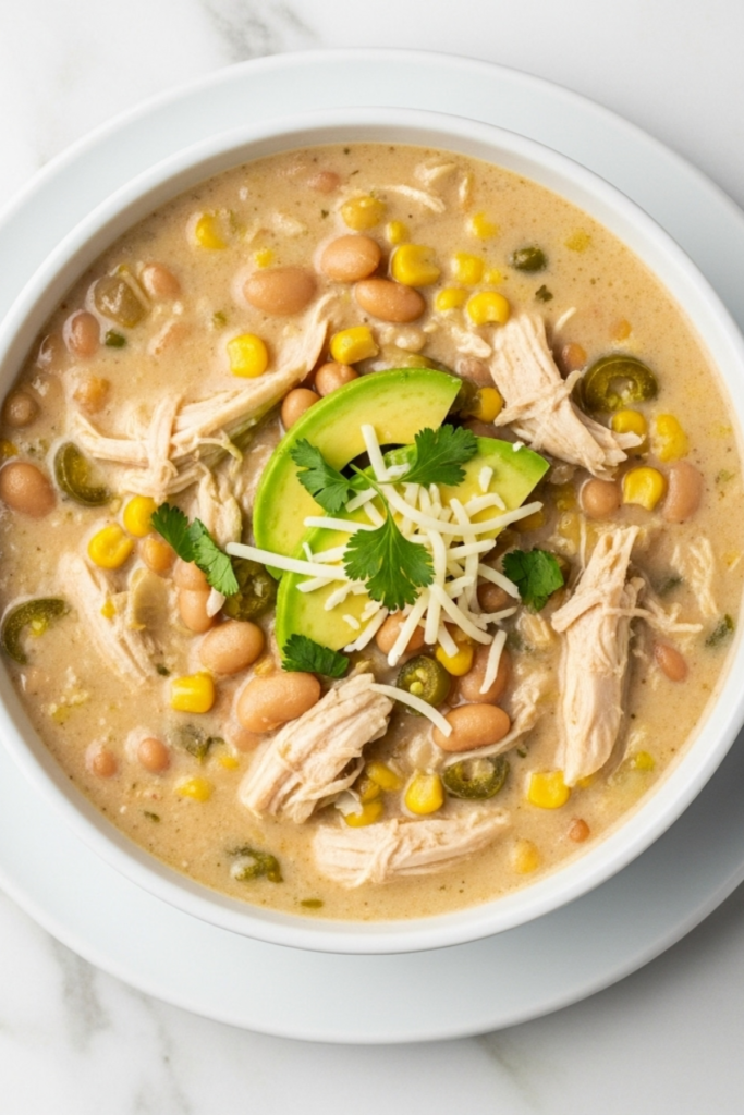 - Crockpot option: Sauté onions/garlic first, then add broth, spices, chilies, and 1 lb raw chicken breasts. Cook on LOW 5–6 hrs or HIGH 3 hrs. Shred chicken, stir in cheese, beans, corn, lime, and cilantro. Heat through before serving.